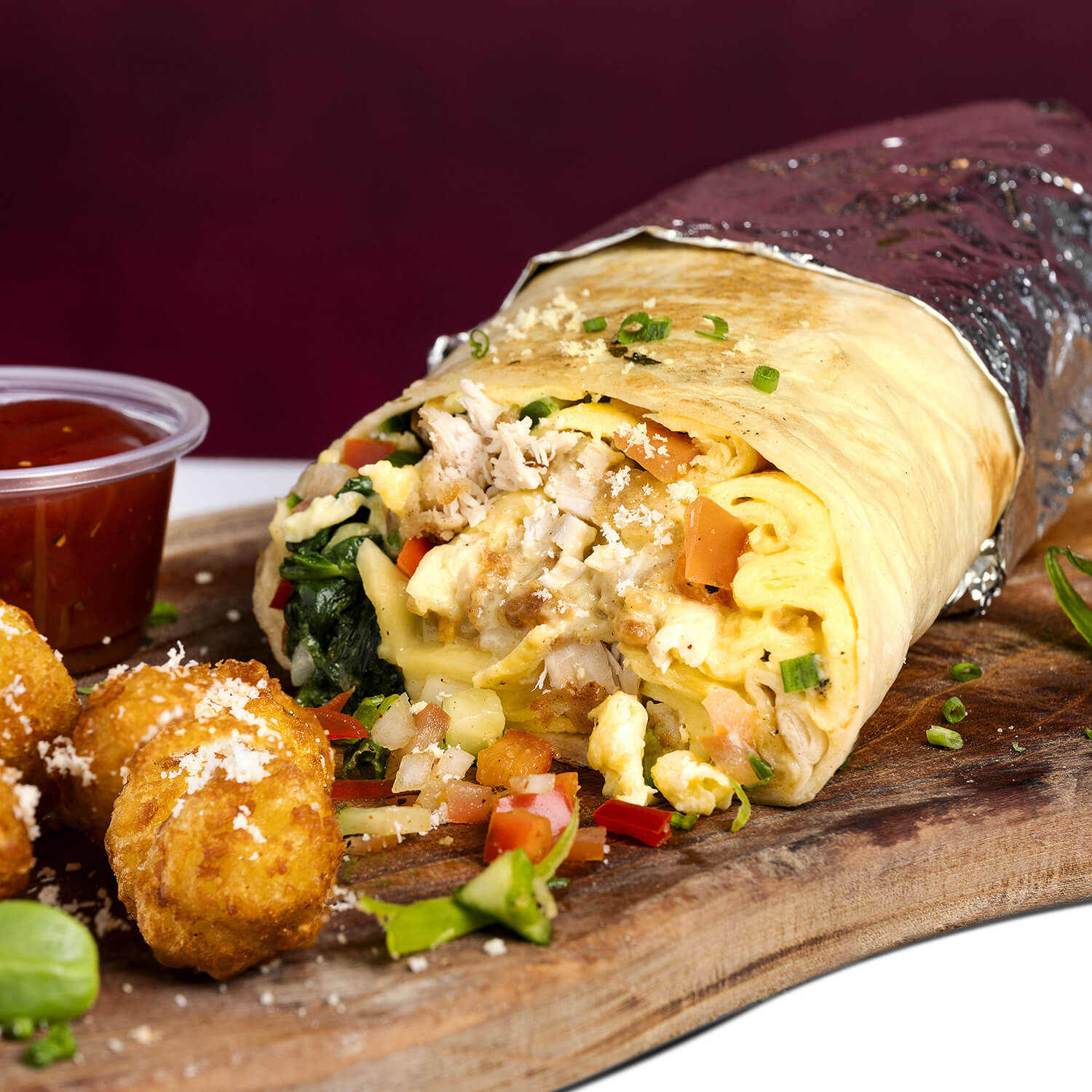 Sausage, Bacon, Egg, Cheese, and a Hash Brown, wrapped in a Toasted Tortilla.